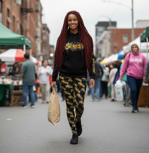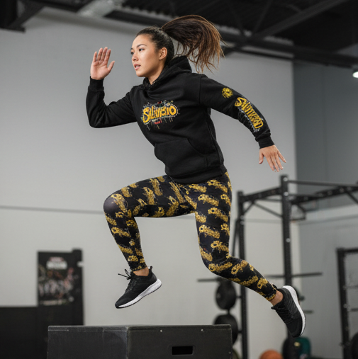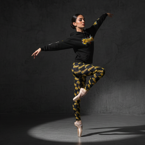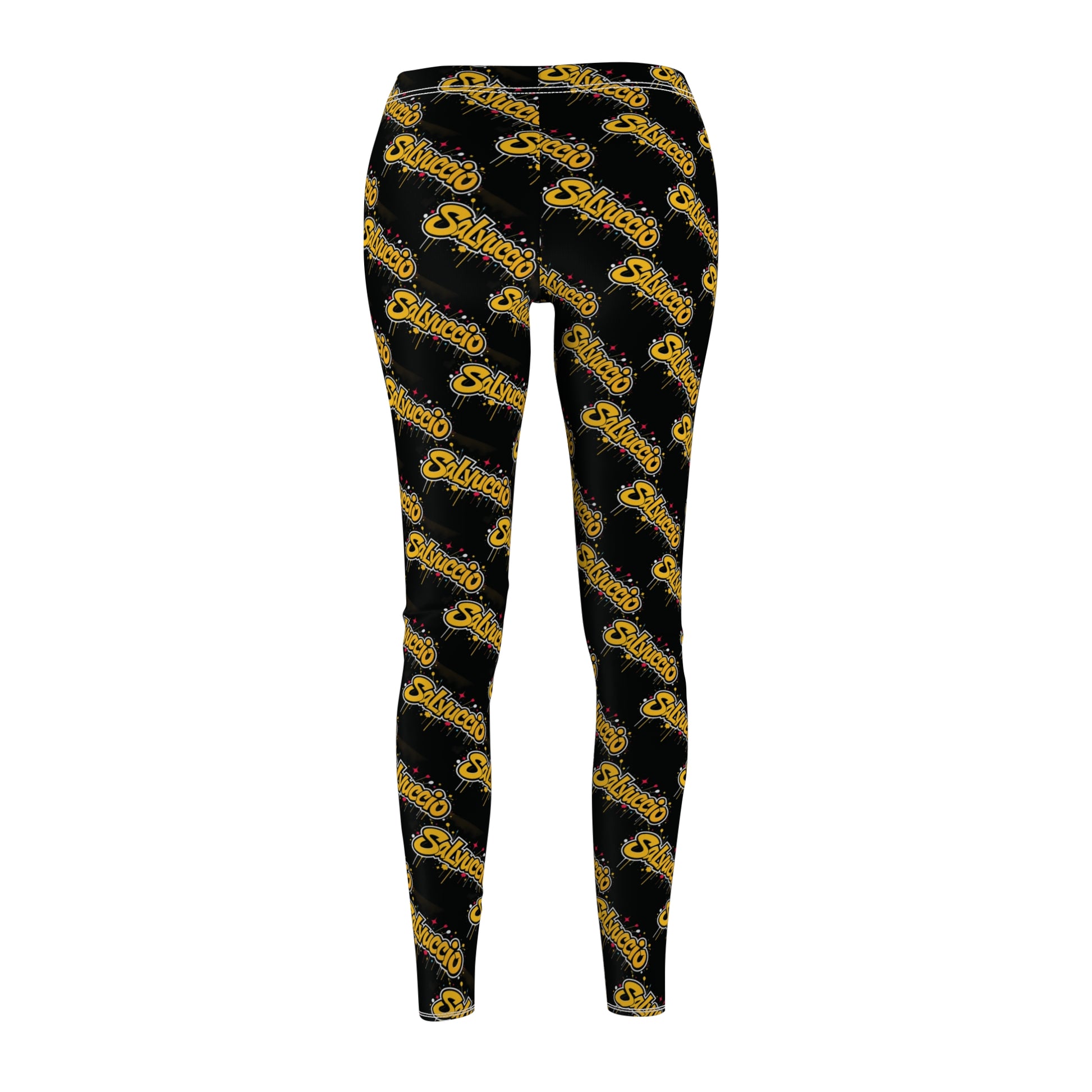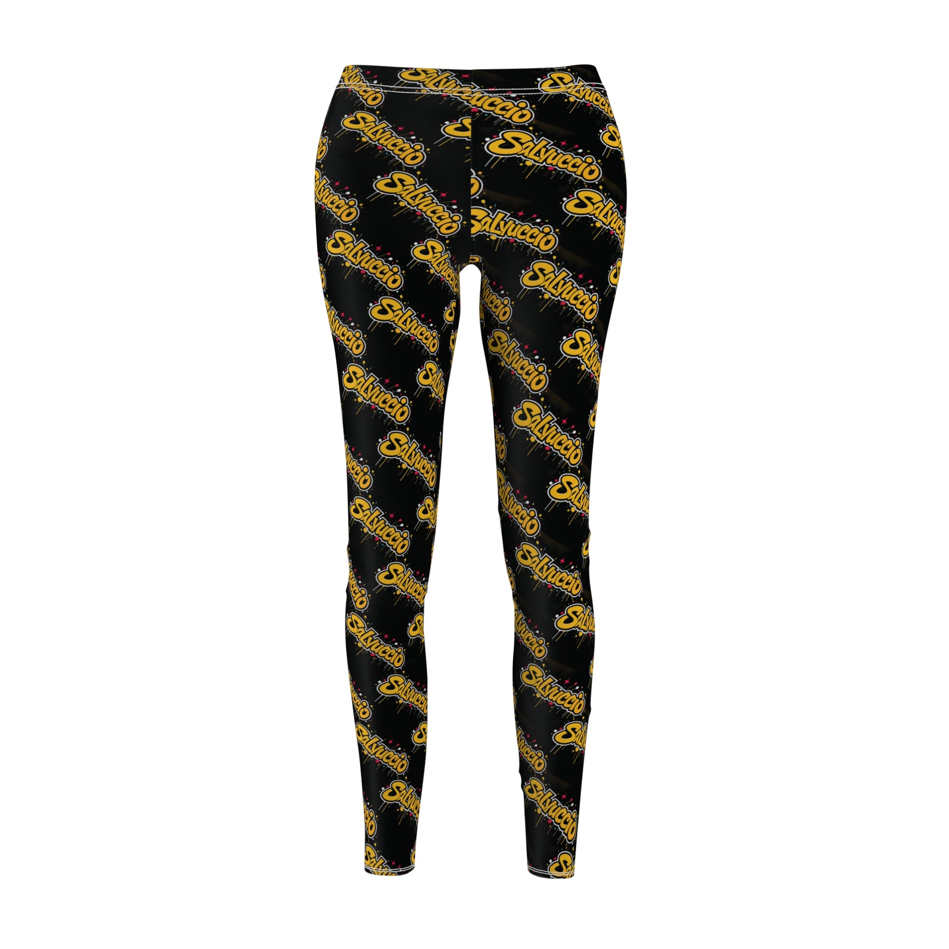 Idio Salvuccio Stylish Women's Casual Graffiti Leggings with Trendy Gold & Black Salvuccio Design. These leggings give a trendy and urban vibe, perfect for casual outings or lounging at home. Ideal for fashion-forward women looking to make a statement. Relevant for holidays, parties, casual wear, and street style occasions.