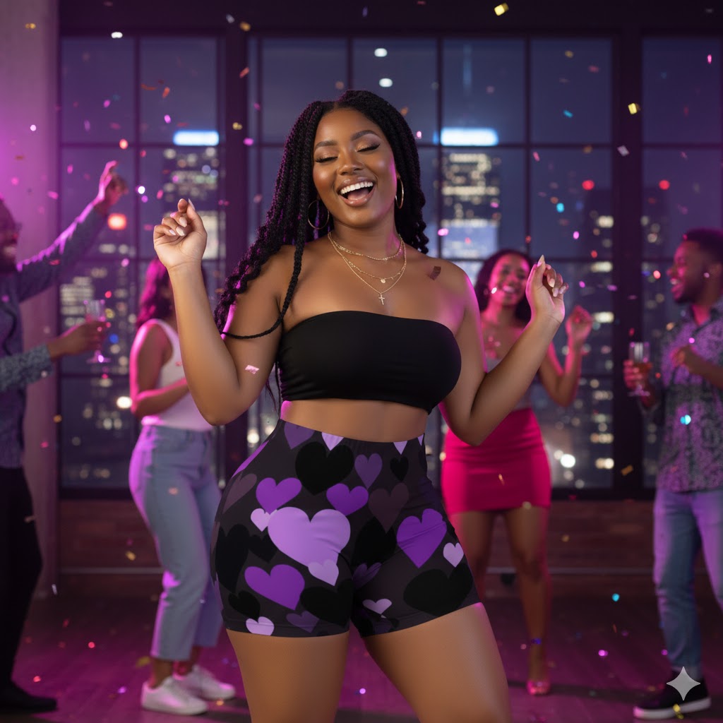 Sweetie's Collection women's athletic shorts with a black and purple heart geometric pattern.